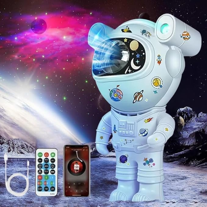 O Projetor Astronauta Galáxia e Estrelas com Bluetooth é ideal para quem busca uma experiência imersiva que une iluminação e som. Ele projeta nebulosas multicoloridas e estrelas brilhantes, criando um clima aconchegante e relaxante no ambiente. Além disso, conta com conexão Bluetooth integrada, permitindo que o usuário reproduza músicas sincronizadas com as projeções, trazendo ainda mais encanto para festas, momentos de estudo ou relaxamento.