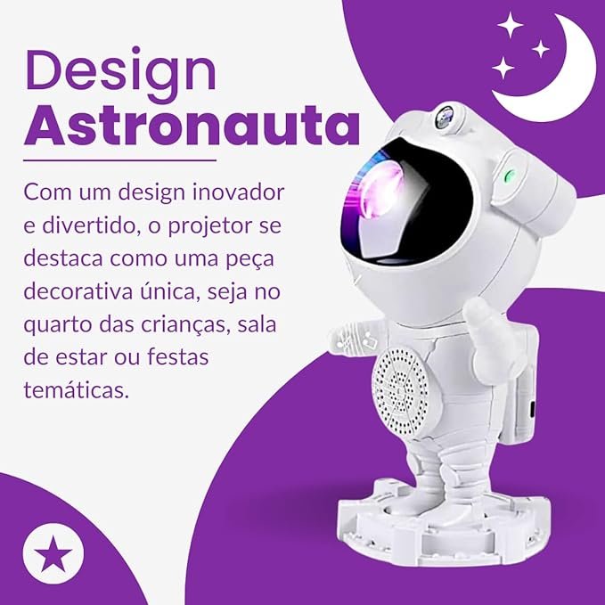 Esse projetor se destaca por unir tecnologia, praticidade e diversão. O som Bluetooth aliado às luzes transforma qualquer espaço em um pequeno universo particular. Seu design moderno em formato de astronauta também agrega valor estético, sendo uma ótima escolha para presentes criativos e funcionais.
