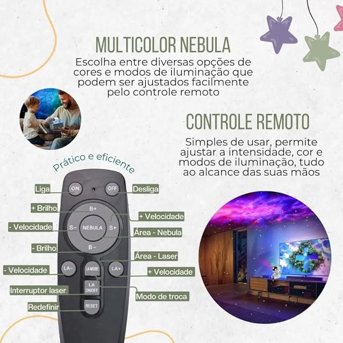 | Recursos | Luz noturna, projetor decorativo, combinações musicais com projeção |